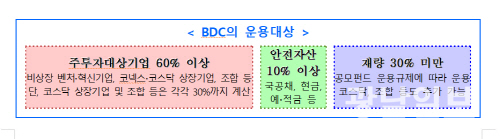 BDC는 개인투자자가 주식시장에서 비상장 벤처기업에 직접 투자할 수 있는 공모펀드다. 주투자대상기업은 비상장 벤처·혁신기업, 벤처조합, 코넥스·코스닥 상장사 등으로 펀드 자산총액의 60% 이상이 여기에 투자돼야 한다.
