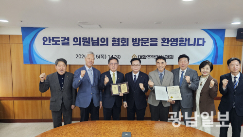 대한주택건설협회는 5일 서울 여의도 건설회관에서 서민 주거 안정과 주택건설업계의 종합부동산세 과세 문제 해결에 기여한 공로로 국회 기획재정위원회 소속 안도걸 의원(더불어민주당·광주 동남을)에게 공로패를 수여했다.