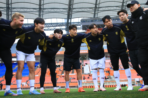 지난 1일 제주SKFC와의 하나은행 K리그1 2026 1라운드 경기에서 광주FC 선수단이 파이팅을 외치고 있다. 사진제공=광주FC