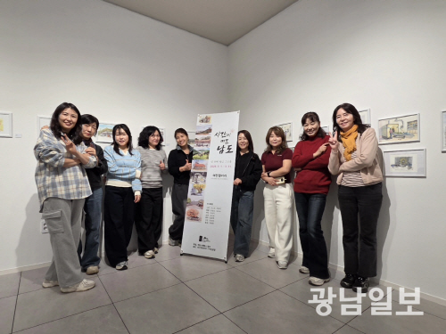 어반 스케쳐스 광주 회원 9명은 오는 31일까지 나주 광주전남혁신도시 빛가람동 여천갤러리에서 ‘시간이 머문 남도, 선 위에 쌓인 그리움’이라는 주제로 어반스케전을 갖는다. 사진은 참여회원들이 전시장 내 배너 옆에서 기념촬영을 하고 있는 모습