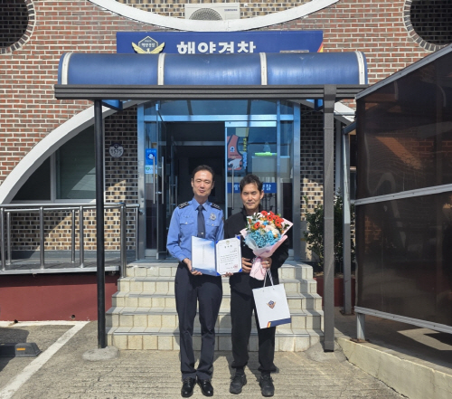 완도해양경찰은 지난달 20일 장흥군 신동항 인근 해상에서 발생한 침수선박 사고 현장에서 승선원 4명을 구조한 김천권 선장(오른쪽)에게 감사장을 수여했다. 사진제공=완도해양경찰서