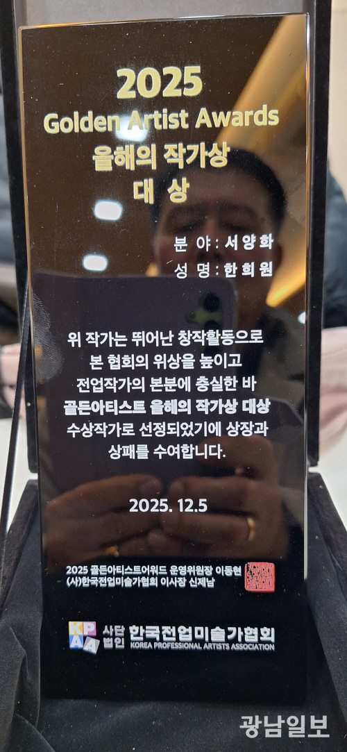 한희원 작가는 (사)한국전업미술가협회(이사장 신제남)와 2025 골든아티스트 어워드 운영위원회(위원장 이동현)가 수여하는 ‘골든아티스트 올해의 작가상 대상’을 수상했다. 선정은 지난해 이뤄졌고, 상패 또한 2025년 12월 5일자로 제작됐지만 시상식은 지난 3일 서울 (사)한국전업미술가협회 사무실에서 뒤늦게 거행됐다.