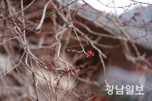 올해 첫 꽃망울 터트린 화엄사 홍매화.
