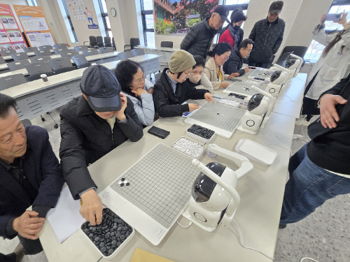 국립광주과학관이 광주인재평생교육진흥원과 협력해 운영하는 광역 단위 성인 문해교육 지원사업 ‘한글햇살버스’에 최종 선정됐다. 사진은 인공지능(AI) 로봇과 오목대전을 체험하는 어르신들.