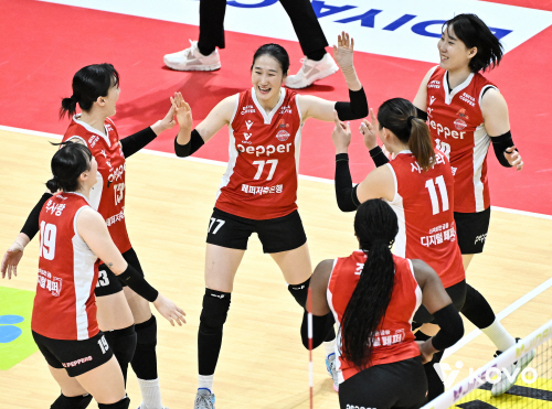 진에어 2025-2026 V리그 여자부 5라운드 다섯 번째 경기에서 정관장을 꺾고 승리를 차지한 AI페퍼스 선수단이 기뻐하고 있는 모습. 사진제공=KOVO