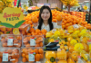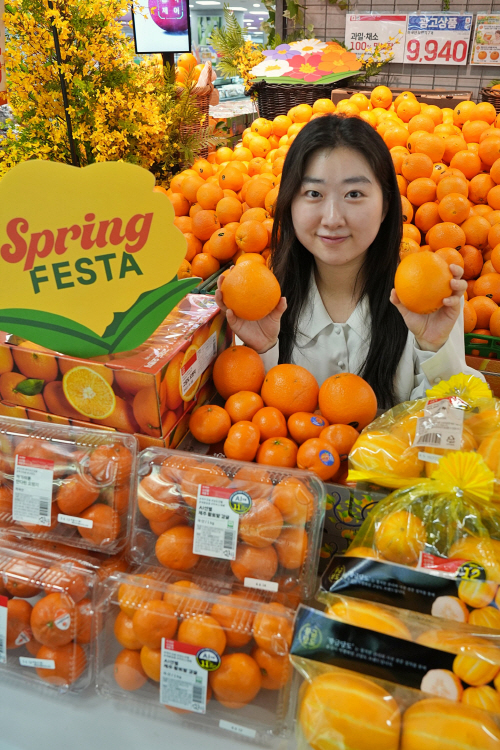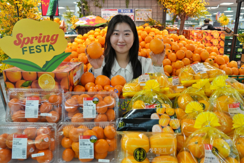 롯데마트는 오는 18일까지 봄철 수요가 높은 오렌지, 감귤, 참외에 대해 할인전을 선보인다. 사진은 서울 송파구 롯데마트 제타플렉스 잠실점 과일 코너에서 직원이 봄 과일 할인전을 홍보하고 있는 모습.