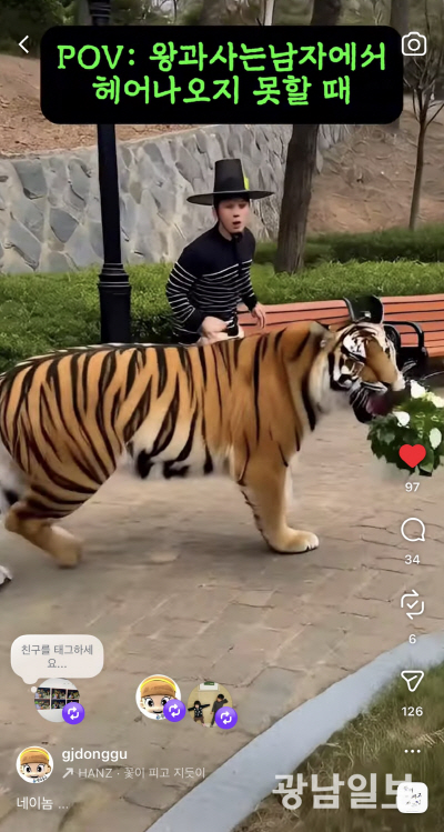 광주 동구는 지난 6일 ‘네 이놈, 과인이 먼저다!’라는 제목으로 28초 영상을 인스타그램, 유튜브에 올렸다. 사진은 장주영 동구 미디어소통팀장이 호랑이와 함께 정원을 뛰는 모습.