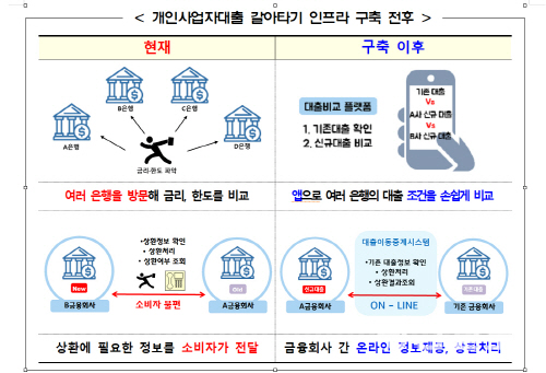 해당 서비스가 시작되면 개인사업자는 신용대출 중 10억원 이하의 운전자금대출을 스마트폰을 통해 새로운 대출로 갈아탈 수 있다.