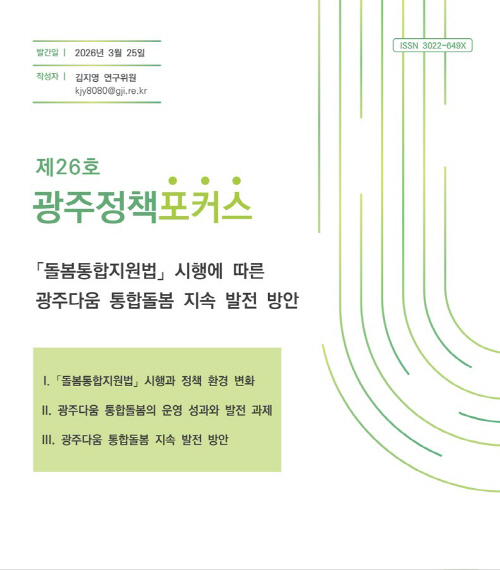광주연구원은 25일 ‘광주정책포커스’ 제26호를 통해 ‘돌봄통합지원법 시행에 따른 광주다움 통합돌봄 지속 발전 방안’을 발간했다.