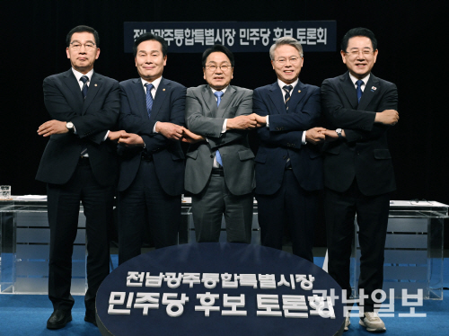 25일 오후 광주 서구 광천동 KBC광주방송에서 열린 민주당 전남광주특별시장 본경선 토론회에서 후보들이 토론에 앞서 손을 맞잡고 있다. 왼쪽부터 신정훈, 주철현, 강기정, 민형배, 김영록 후보. 최기남 기자 bluesky@gwangnam.co.kr
