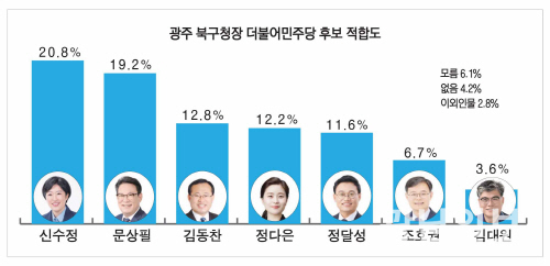 25일 광남일보가 여론조사 전문기관 코리아정보리서치에 의뢰해 지난 20~21일 광주 북구에 거주하는 만 18세 이상 남녀 504명을 대상으로 실시한 여론조사 결과 더불어민주당 북구청장 후보 적합도 조사에서 신수정 광주시의회 의장이 20.8%로 가장 앞선 가운데 문상필 더불어민주당 중앙당 부대변인이 19.2%를 기록하며 박빙의 경쟁 구도를 그리고 있는 것으로 조사됐다.
