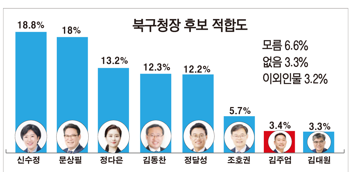 북구을에서는 신수정 후보가 18.0%로 선두를 달렸고, 문상필 후보(14.7%), 김동찬 후보(14.2%), 정달성 후보(14.2%), 정다은 후보(11.2%), 조호권 후보(7.2%), 김주업 후보(3.8%), 김대원 후보(2.7%) 순으로 집계됐다.