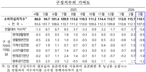 26일 한국은행 광주전남본부가 발표한 ‘2026년 3월 광주·전남지역 소비자동향조사’ 결과에 따르면 소비자심리지수(CCSI)는 110.1로 지난달보다 5.6p 하락했다.
