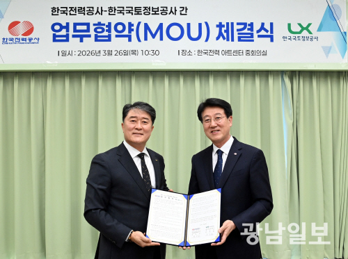 26일 한국전력에 따르면 한전은 이날 서울 한전 아트센터에서 한국국토정보공사와 ‘전력설비 위치정보 관리 협력을 위한 업무협약’을 체결했다. 협약식에는 정치교 한전 안전·영업배전부사장과 이주화 LX 부사장이 참석했다.