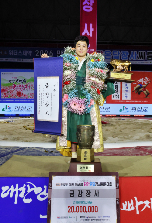 영암군민속씨름단 최정만이 ‘위더스제약 2026 민속씨름 단양온달장사씨름대회’에서 금강급(90㎏ 이하) 우승을 차지했다.