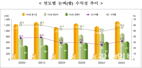 순수익률은 31.7%로 전년 대비 8.2%p 상승해 2021년(38.8%) 이후 가장 높은 수준을 나타냈다. 이 같은 수익성 개선은 산지 쌀값 상승이 주된 요인으로 분석된다.