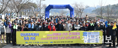 28일 오전 전남 나주시 빛가람 호수공원 일원에서 열린 ‘제22영산강 사랑 시·도민 한마음 걷기대회’에 참석한 이승배 광남일보 사장, 서옥현 한국전문임업인협회 나주시협의회장등 내빈들과 시·도민들이 힘차게 출발하고 있다.