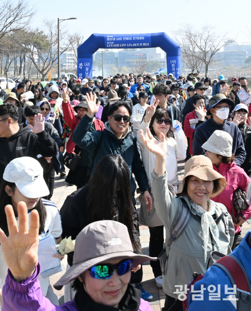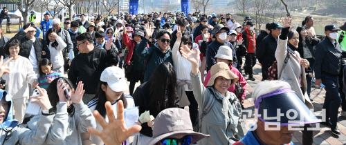 29일 오전 나주시 빛가람 호수공원 일원에서 열린 ‘제22회 영산강 사랑 시·도민 한마음 걷기대회’에 참가한 시·도민들이 수변공원 일원을 걸으며 봄기운을 만끽하고 있다.최기남 기자 bluesky@gwangnam.co.kr