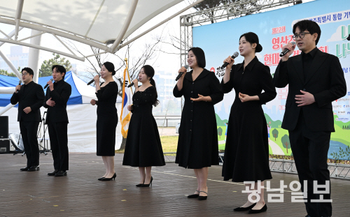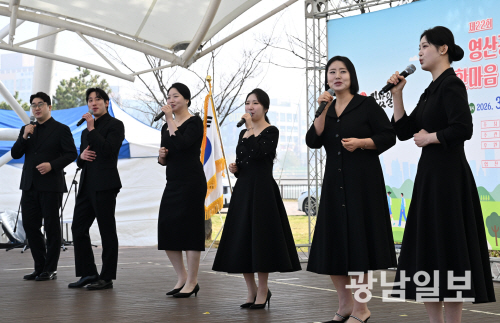 28일 오전 전남 나주시 빛가람 호수공원 일원에서 열린 ‘제22영산강 사랑 시·도민 한마음 걷기대회’에서 나주시립합창단의 삭전 공연이 펼쳐지고 있다. 최기남 기자 bluesky@gwangnam.co.kr