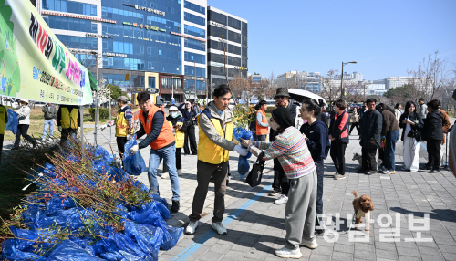 28일 오전 전남 나주시 빛가람 호수공원 일원에서 열린 ‘제22영산강 사랑 시·도민 한마음 걷기대회’및 ‘제10회 나무 나누어주기’행사에서 서옥현 한국전문임업인협회 나주시협의회장이 시민들에게 나무를 나누어주고 있다. 최기남 기자 bluesky@gwangnam.co.kr