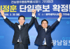 신정훈·강기정 더불어민주당 전남광주통합특별시장 경선 예비후보가 30일 오전 광주시의회에서 신정훈 단일 후보를 발표하며 맞잡은 두 손을 들고 기념 촬영을 하고 있다. 최기남 기자 bluesky@gwangnam.co.kr