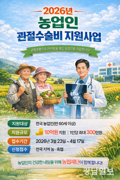 지원 대상은 관절질환으로 병원에서 수술 권유를 받은 만 60세 이상 농업인이다. 신청은 4월 17일까지 전국 지역 농·축협을 통해 접수하며, 이후 심사를 거쳐 최종 지원 대상자를 선정한다.