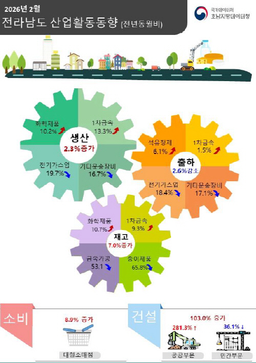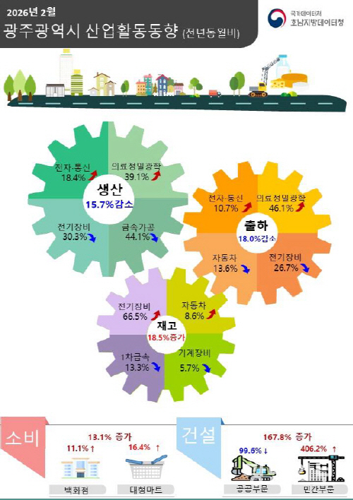 31일 국가데이터처 호남지방데이터청이 발표한 ‘2026년 2월 광주·전남 산업활동동향’에 따르면 광주의 광공업 생산은 전년 동월 대비 15.7% 감소했다.