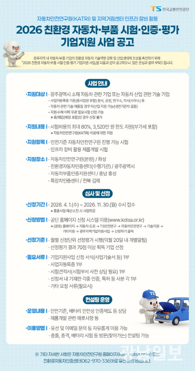참가 신청은 오는 11월 30일까지 연중 수시 접수(예산 소진 시 마감) 방식으로 진행되며, 선정된 기업은 시험·인증·평가 비용의 최대 80%(3520만원)를 지원 받는다.