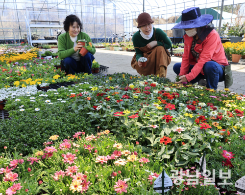 1일 오후 광주 북구 석곡동의 한 화훼 농원을 찾은 시민들이 집안 곳곳에 산뜻한 봄 기운을 불어넣을 꽃을 구입하기 위해 살펴보고 있다.최기남 기자 bluesky@gwangnam.co.kr