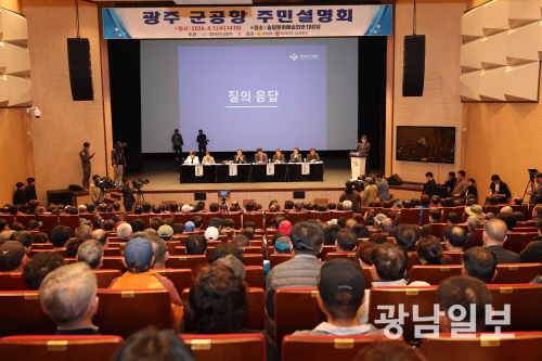 1일 전남 무안군 승달문화예술회관 대강당에서 열린 광주 군공항 주민 설명회에서 질의응답이 이뤄지고 있다. 최기남 기자 bluesky@gwangnam.co.kr