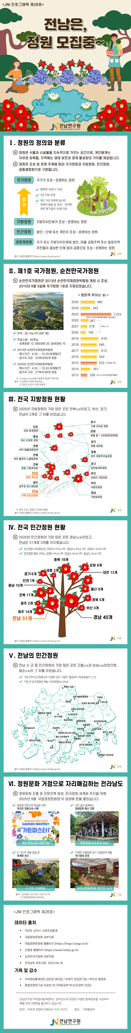 전남연구원은 2일 식목일을 앞두고 ‘JNI 인포그래픽 ‘전남은, 정원 모집 중~’을 발간하고 전국 정원 현황과 전남의 경쟁력을 분석했다. 국가정원, 지방정원, 민간정원 등 유형별 구조를 종합적으로 비교한 결과, 전남은 정원 자원이 집적된 지역으로 산업화 기반을 갖추고 있다는 평가다.
