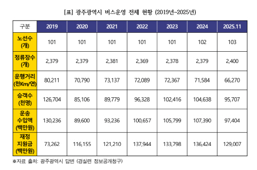 광주 시내버스 준공영제가 막대한 재정 지원에도 불구하고 이용 수요와 운영 효율성 측면에서 뚜렷한 개선을 보이지 못하고 있는 것으로 나타났다.
