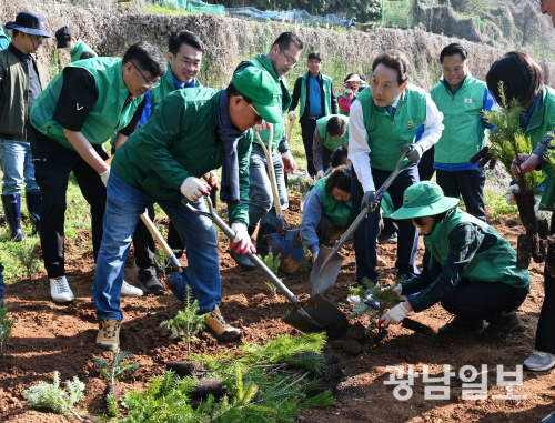 광주시동구새마을회(회장 김대영)는 2일 오전 광주 동구 학운동 학운초등학교 뒷동산에서 새마을 지도자들및 학부모회 임원들과 함께 팥배나무, 야광나무, 구상나무 등 묘목 약 4000주를 심는 도심 속 한반도 숲속 공간을 조성하는 봄맞이 나무심기 행사를 실시했다. 최기남 기자 bluesky@gwangnam.co.kr