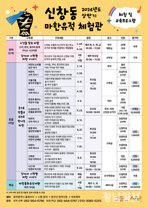 광주역사민속박물관장은 “마한유적체험관에서 진행되는 이번 교육 프로그램을 통해 자라나는 세대가 신창동 유적과 마한 문화를 직접 체험하며 광주의 과거와 현재를 연결해보는 의미 있는 시간이 되길 기대한다”고 말했다.