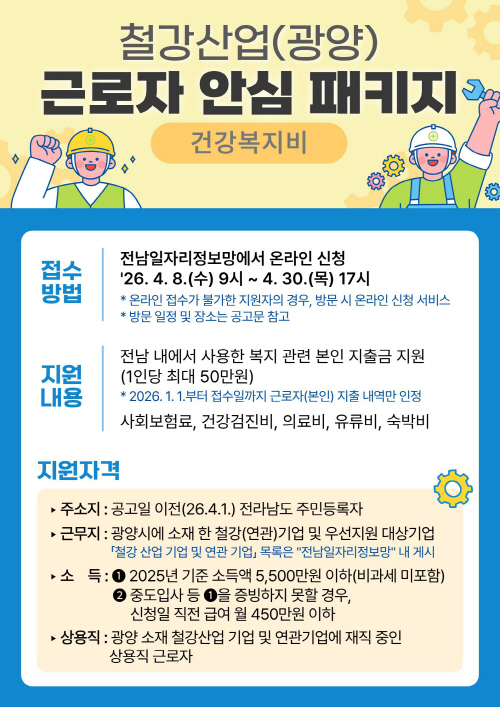 광양시는 철강산업 고용위기에 대응하고 재직 근로자의 고용 유지와 생활 안정을 지원하기 위해 전남도와 함께 고용노동부 ‘철강산업 상용직 근로자 안심패키지(건강복지비)’ 사업을 추진한다.