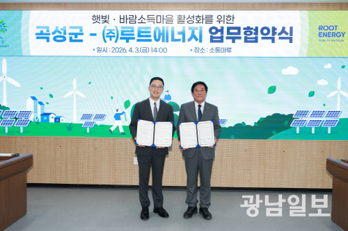 9일 곡성군에 따르면 최근 재생에너지 전문기업 ㈜루트에너지와 ‘햇빛·바람소득마을 활성화를 위한 업무협약’을 체결하고, 주민 주도형 에너지사업 추진을 위한 협력체계를 구축했다.