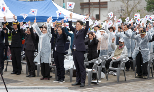 황기연 전남도지사 권한대행이 10일 전남 항일독립운동기념탑에서 열린 ‘제107주년 대한민국임시정부수립 기념식’에서 참석자들과 만세삼창을 하고 있다.