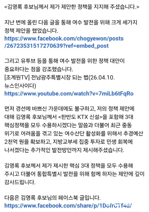 조계원 의원은 이날 페이스북을 통해 “여수발전을 위해 제가 제시한 ‘한반도 KTX’ 신설 등 3대 정책 제안을 김영록 예비후보가 모두 수용했다“며 ”최근 중동 위기로 어려움을 겪고 있는 여수산단 활성화를 위해 추경예산 2,000억 원을 확보하고, 지방교부세 집중 투자로 민생 회복에 나서겠다는 추가적인 발전 방안까지 제시했다“고 밝혔다.