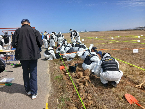 13일 전남 무안군 무안국제공항에서 경찰과 유가족 등이 12·29 여객기 참사 희생자 미수습 유해를 찾기 위한 재수색을 하고 있다. 사진제공=12·29 무안공항 제주항공 참사 유가족협의회