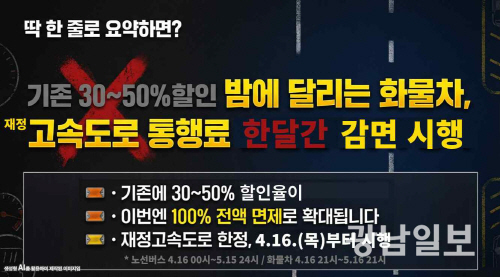 심야 화물차는 현재 30∼50%의 통행료 감면 혜택을 제공하는 데서 100% 면제로 확대한다.