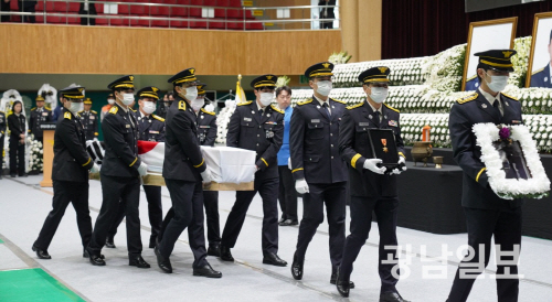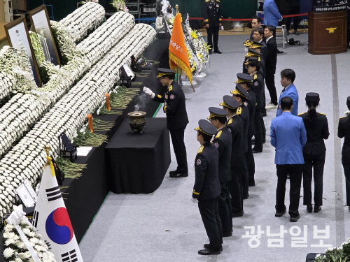 영결사에 나선 전남도지사 권한대행은 “오늘 우리는 두 분의 소방 영웅을 눈물로 떠나는 자리에 서 있다”며 “수많은 재난 현장을 지킨 세 남매 아버지인 박승원 소방경과 젊은 나이에 소방을 택한 패기 있는 노태영 소방교의 비보는 우리의 마음을 아프게 한다”고 밝혔다.