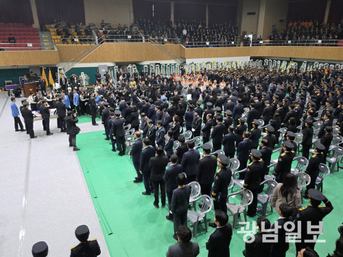 완도 화재 현장에서 순직한 두 소방관 고 박승원 소방경(44)과 노태영 소방교(30) 합동 영결식이 14일 완도군농어민문화체육센터에서 전남도청장(葬)으로 엄수됐다. 소방대원들이 제단 앞에 서서 순직 소방관들의 넋을 기렸다.