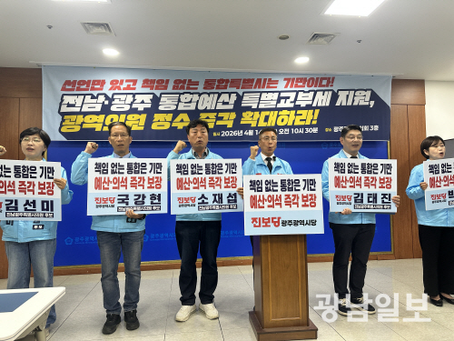 진보당 이종욱 통합특별시장 후보와 김태진·소재섭·국강현·김선미·박미경 특별시의원 후보들은 14일 광주시의회 브리핑룸에서 기자회견을 열고 “통합특별시의 성공은 초기 행정과 정치의 융합이 얼마나, 어떻게 진행되느냐가 관건”이라며 마중물 예산과 의원 증원을 요구했다.