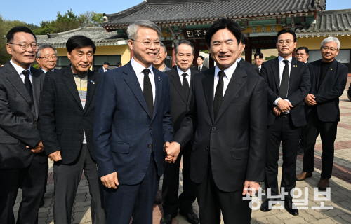민형배 더불어민주당 전남광주통합특별시장 후보와 김대중 전남광주통합교육감 예비후보가 15일 오전 광주 북구 운정동 국립 5·18민주묘지 민주의문 앞에서 만나 인사하고 있다.최기남 기자 bluesky@gwangnam.co.kr