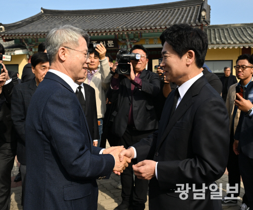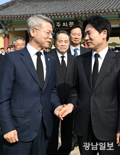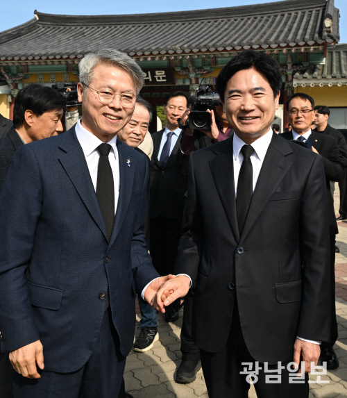 민형배 더불어민주당 전남광주통합특별시장 후보와 김대중 전남광주통합교육감 예비후보가 15일 오전 광주 북구 운정동 국립 5·18민주묘지 민주의문 앞에서 만나 인사하고 있다.