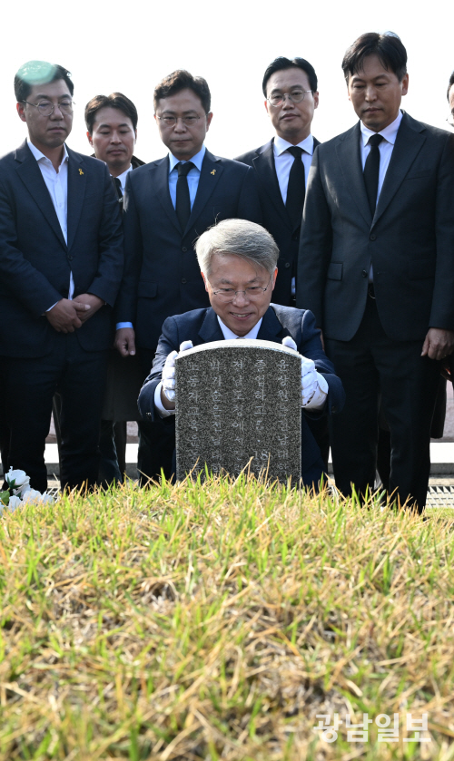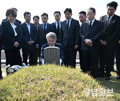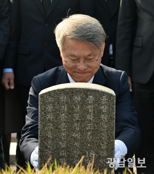 민형배 더불어민주당 전남광주통합특별시장 후보가 15일 오전 광주 북구 운정동 국립5·18민주묘지를 찾아 윤상원 열사 묘지를 참배하고 있다. 최기남 기자 bluesky@gwangnam.co.kr