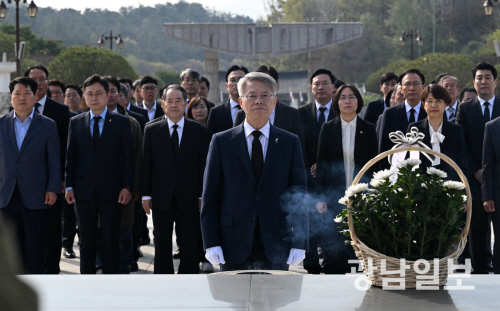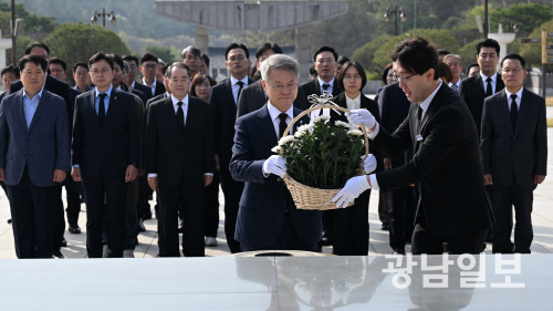 민형배 더불어민주당 전남광주통합특별시장 후보가 15일 오전 광주 북구 운정동 국립5·18민주묘역을 찾아 헌화 참배하고 있다. 최기남 기자 bluesky@gwangnam.co.kr