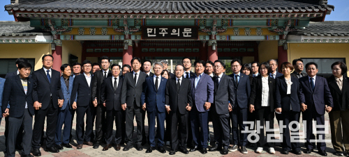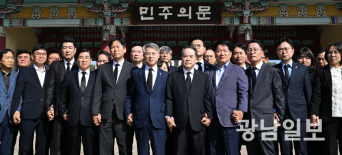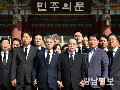 민형배 더불어민주당 전남광주통합특별시장 후보가 15일 오전 광주 북구 운정동 국립5·18민주묘지를 찾아 참배 후 입장을 밝히고 있다. 최기남 기자 bluesky@gwangnam.co.kr1