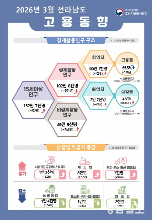 지난달 전남의 고용률은 65.5%로 전년 동월 대비 0.3%p 하락했지만 취업자는 100만1000명으로 2000명 증가했다.