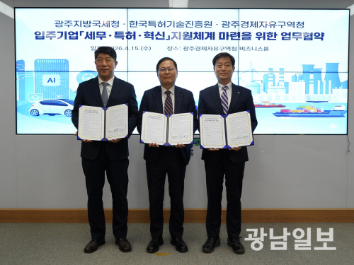 광주경제자유구역청과 광주지방국세청, 한국특허기술진흥원은 15일 광주경자청 비즈니스룸에서 ‘광주경제자유구역 핵심 전략산업 기업 육성 및 기술 경쟁력 강화를 위한 업무협약(MOU)’을 체결했다.